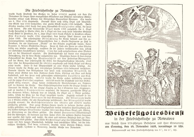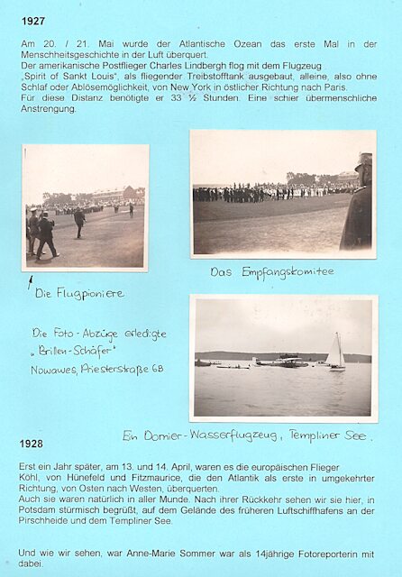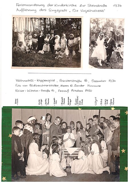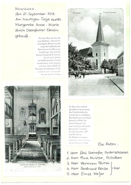Am 06. Juli 1913 wurde ich, die Anne-Marie, in Nowawes, im vorgenannten Haus geboren und am 21. September 1913 in der Friedrichskirche von Oberpfarrer Dessin getauft. Der Weg dorthin, durch die kurze Lutherstraße, war nicht weit. Ihr sahet vorhin auf dem ersten Bild sogar schon das spitze Dach des Kirchturms in der Schaufensterscheibe des elterlichen Geschäfts. Meine Taufpaten, die mich gütig fördernd ein Stück meines Lebensweges begleiten wollen, sind: Onkel Emil Seehafer, in Berlin, Ehemann von Muttis Schwester Johanna. Dann dann die Architekten Paul Muster und Hermann Blohm sowie der Nowaweser Stadtbau-Inspektor Ferdinand Pehlke. Dann gab es aber noch diesen Paten Ernst Meyer, den ich nie wieder gesehen habe.