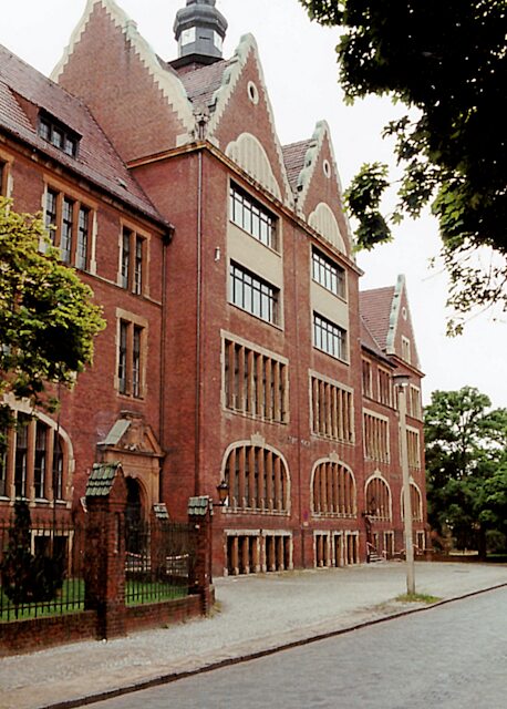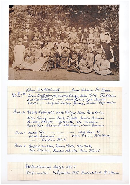 Unsere gesamte Klasse zieht um. Wir gehen nun ein gutes Stück Fußweg weiter und in die Gemeindeschule I., Scharnhorststraße (Stephensonstr.), in den noch ziemlich neuen Schul-Palast. Hier ist es fein. Meine Klassenlehrerin ist Fräulein Hoppe. Unterricht haben wir auch beim Herrn Lehrer Drahtschmidt. Der Ernst hat sich bisher als nicht sehr bedrohlich erwiesen.