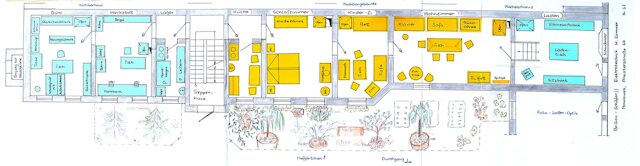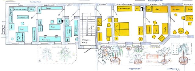 Die Betriebsräume (blau) etwas vergrößert ... mit dem Anschluss zur Wohnung (gelb). Diese Räume waren ursprünglich eine Zwei-Raumwohnung mit Küche – inzwischen aber ist es die Unterkunft für einen kleinen Gewerbebetrieb. Diesen erreicht man über das eben erwähnte Neben-Treppenhaus. Neben der Abstellkammer und dem Werkraum, kommt man ganz links / hinten in das „Allerheiligste“, das Bureau oder Kontor. Da sitzen der Chef, der Buchhalter, dort steht der Schrank mit den äußerst wichtigen Innungsakten und auch jener mit wertvollen Werkzeugen und Materialien, die nur der Chef ausgibt. Vater Max Sommer ist u. a. Schriftführer der „Elektriker-Innung Potsdam und Umgegend“ – daher diese Akten in unseren vier Wänden, er bildet selbstverständlich Lehrlinge aus von denen er die Besten als Monteur-Gesellen zeitweise behält und hat seinen Sitz im Prüfungsausschuss für angehende Gesellen und Meister. Ebenso ist er in diesem Fachgebiet Gerichtssachverständiger bei Versicherungs- und anderen Schadensfällen.