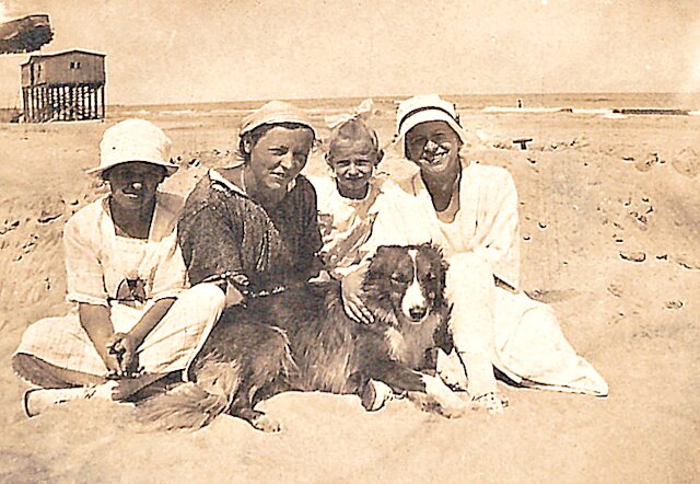 Auch die Familie Schulz aus Berlin hat dort ein Ferienzimmer. Auf dem Bild: die drei Schwestern Schulz. Ich bin das Mädchen mit dem Propeller auf dem Kopf und vor uns der sehr liebe und verständige „Prinz“ Urban.