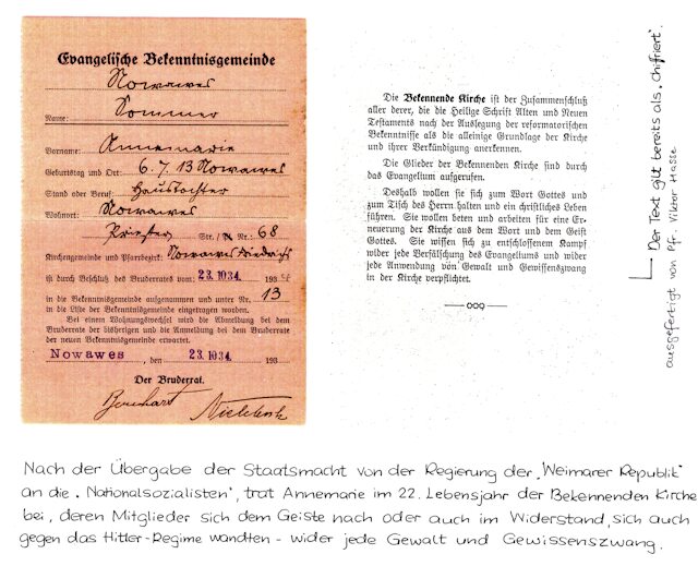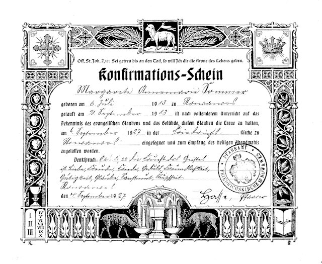 Am 4. September 1927 werde ich mit 14 Jahren in den Kreis der erwachsenen Gemeindeglieder aufgenommen. Der Spruch für mich stammt aus dem Galater-Brief des Paulus, Kapitel 5, Vers 22: >Die Frucht des Geistes ist Liebe, Freude, Friede, Geduld, Freundlicheit, Güte, Vertrauen, Sanftmut und Treue<. Dieser Spruch, den Herr Pfarrer Viktor Hasse für mich wählte, ist mir eine erstrebenswerte Richtschnur für mein Leben. So, wie es mir angeboten wird, möchte ich es halten.