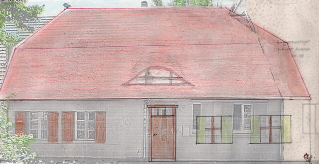 Hier sehen wir die originale Gestalt dieses Gebäudes, errichtet im Jahre 1753 auf der Parzelle Nowawes 122 und die Änderung am rechten (westlichen) Teil.