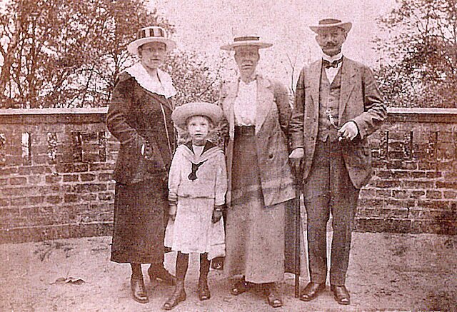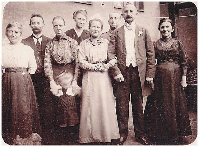 Vorn: Tante Marie Steiner, geb. Sommer, dann meine Mutter mit mir, wie ihr deutlich seht. . Dann Tante Emma und mein Onkel Paul Sommer, die heute 25 Jahre verheiratet sind, sowie meine Tante Hedwig Knoll, geb. Sommer. Drei von den vier Sommer-Geschwistern sind also hier versammelt. – Nur unser Vater fehlt. (Warum? – das seht ihr auf dem nächsten Bild).