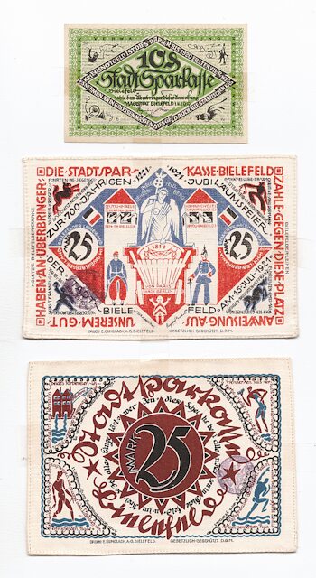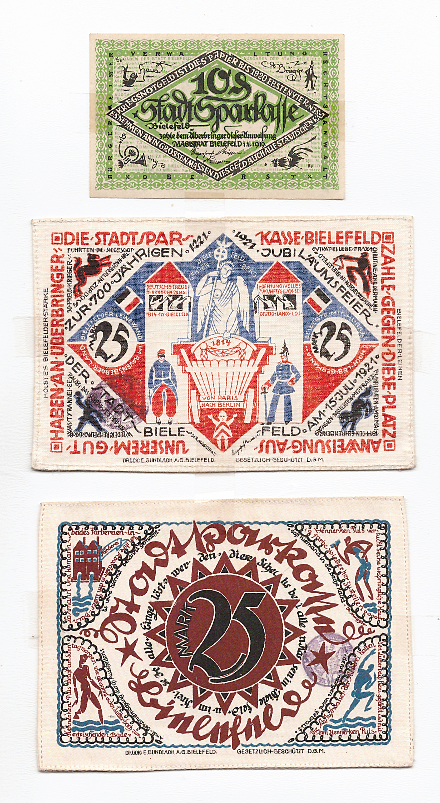 Wegen des Einfallsreichtums der Herausgeber wurden diese Wert-„Papiere“ schnell zu Sammelobjekten, denn als Träger der Gestaltung kamen verschiedene interessante Materialarten zum Einsatz, wie beispielsweise Blech- oder Holztäfelchen. In diesen Bildbeispielen aber Geld auf Baumwolle und auch auf Leinen gedruckt.