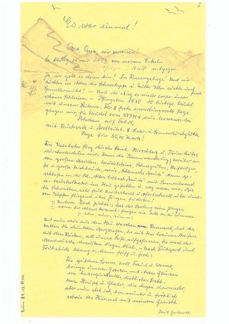 Es geht zur Schneekoppe im Riesengebirge. „Den Bericht dazu“ schrieb Anne-Marie aber erst 1994, mit 81. Lebensjahren aus ihrer Erinnerung, als ihre Nachkommen ebenso dieses Ziel hatten – allerdings bei geringerer Anstrengung, mit mehr Komfort aber weniger Intensiv-Erlebnissen. Hier ein Auszug / 2 Seiten.