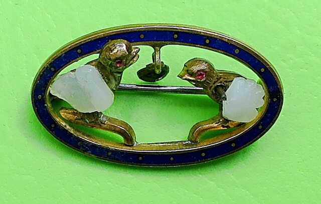 Zur Wiederkehr meines Geburtstages am 6. Juli 1916 bekomme ich von den Eltern eine Brosche geschenkt, damit ich besonders „schmuck“ aussehe. Die Brosche stellt zwei junge Vögel dar. Werden diese auch mich beflügeln? Das Original hat eine Größe von etwa 30 x 15 mm.