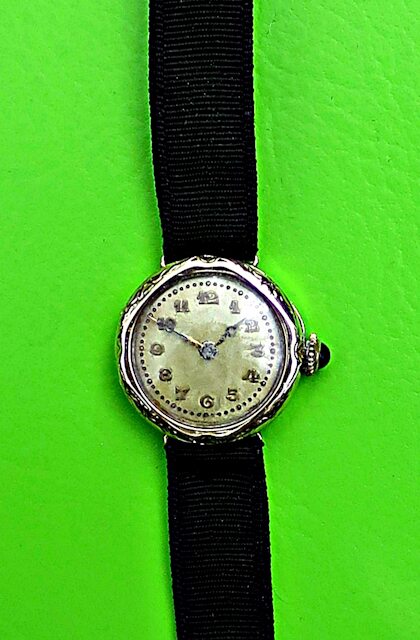 Der sichtbare Glasdurchmesser: 17 mm, im Aufziehkrönchen ein kleiner grüner mineralischer Schmuckstein.