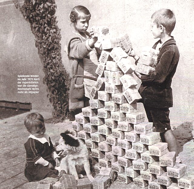 Die neuen Geldscheine zeigen wieder ganz kleine Werte. Mit jenen wird aber nicht gespielt. Verboten! Zu wertvoll! Ein „Trost für die Kinder: es gibt noch genug ungültig gewordene Münzen.