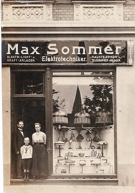 Die Familie Sommer lebt „rechts vom rechten Baum“. Vorn an der Straße die Elektro-Verkaufsstelle, dahinter (hier unsichtbar) die Wohnräume. Ganz am Ende, an das Gartenland grenzend, das Büro und der Werkstattraum des Kleinbetriebes.