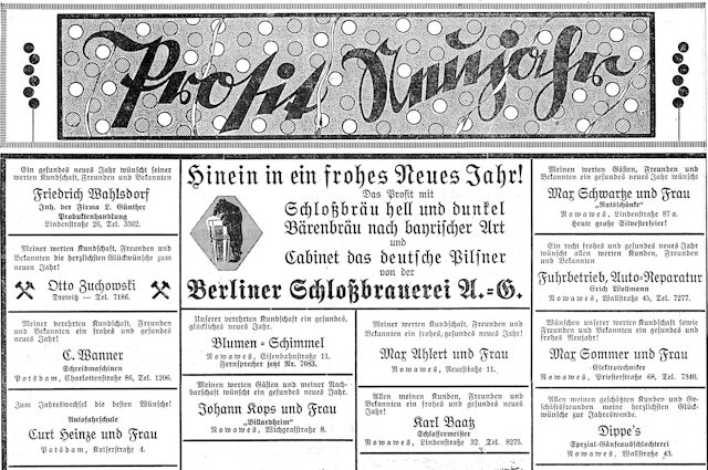 Unsere große Weihnachtsveranstaltung mit der Darbietung auch des Schneeflockenreigens mussten / durften wir wegen des überstarken Zuspruchs der Bevölkerung am 28. Dezember '27 wiederholen. Klemms Festsäle am Ende der Wilhelmstraße (=> Alt Nowawes), kurz vor dem Parkeingang Grenzstraße, waren auch diesmal sehr gut vom interessierten Publikum gefüllt.