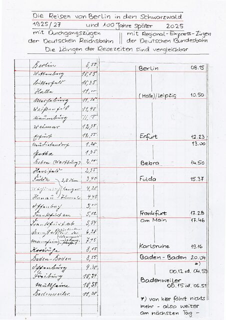 Die Reise unserer Familie in den Schwarzwald ist dagegen weniger spektakulär. Ihr seht hier unseren ganz persönlichen Fahrplan, von Vater Max geschrieben, und den Reisedauer-Vergleich, wenn Ihr die gleiche Strecke ein Jahrhundert später ebenfalls mit der Bahn zurücklegen wollt.