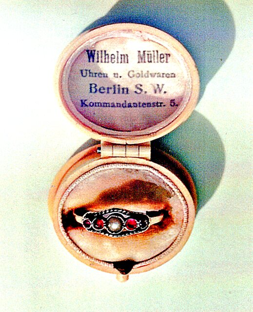 Eine riesige Überraschung. Woran ich mit überhaupt keinem Gedanken war – meine Cousins Walter und Felix Knoll verehren mir einen Ring, zentral geschmückt mit einer Perle, jene beidseits von zwei Rubinen flankiert.