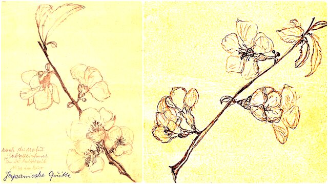 Vater ist nicht im Kontor, sondern auf Baustellenbesuchen. Da kann ich es mir leisten, im Büro schnell mal einige Quittenzweige skizzenhaft „zu konservieren“, bevor diese verblühen.