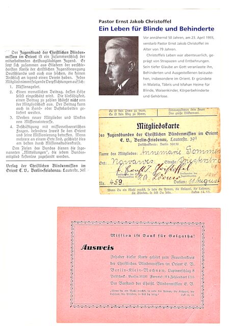 Seit August '31 bin ich Mitglied bei der Missionsarbeit für blinde / sehgeschädigte und anderweitig behinderte Menschen aber auch für Jene, die aus weiteren Gründen als stark benachteiligt gelten, obwohl sie alle nichts dafür können und bisher ihren Lebensunterhalt nicht alleine verdienen können. Eine gütig helfende medizinisch und soziale segensreiche Arbeit. Die Organisation gehört zur Äußeren Mission, die vorerst im Orient mit dem Schwerpunkt Persien, tätig ist. Dorthin komme ich noch nicht zum persönlichen Einsatz aber Pastor Christoffel wanderte mit uns und berichtete dabei viel über diese Tätigkeit und ihre Ergebnisse.