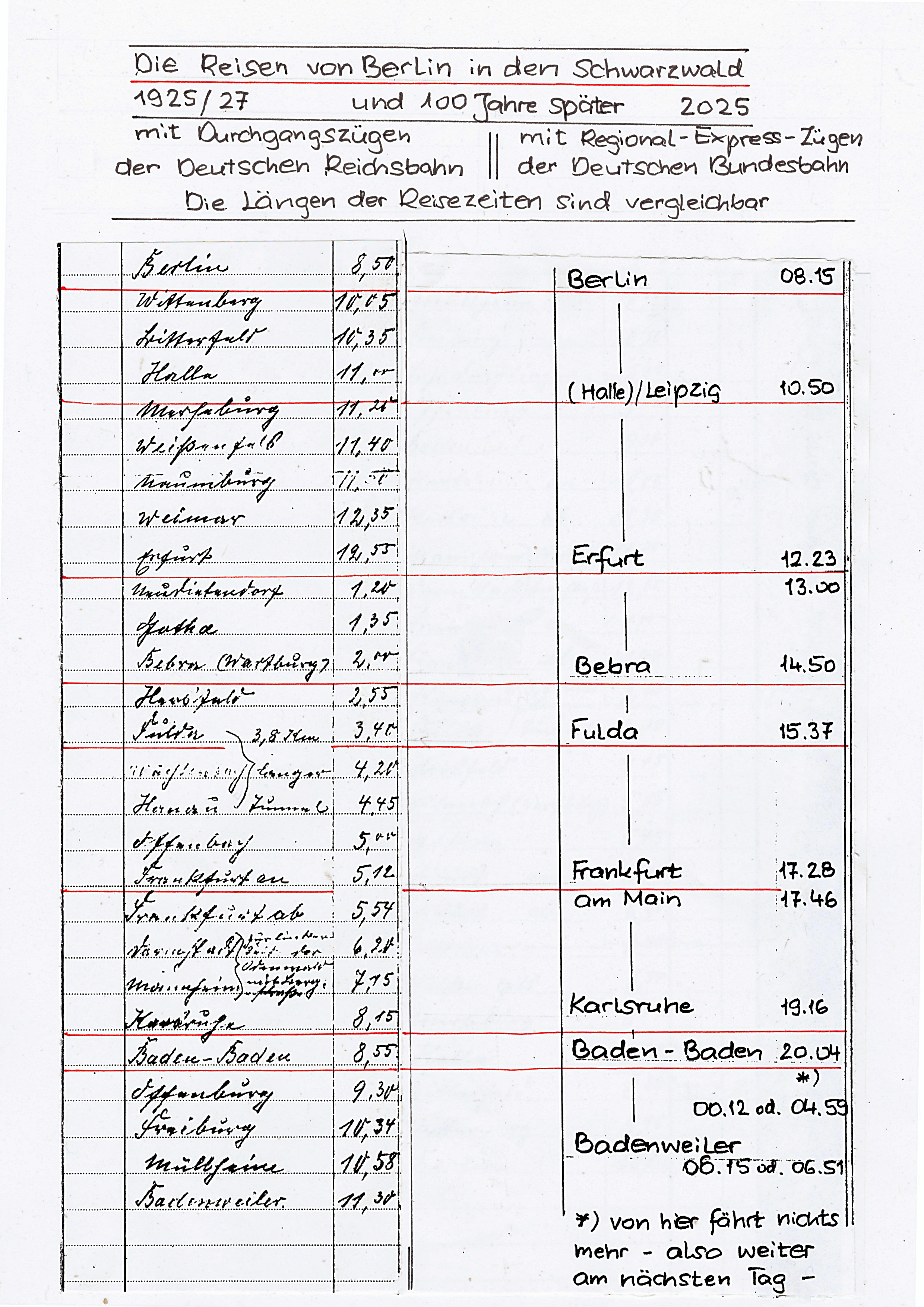 Den Fahrplan (links) schrieb Vater Max und 100 Jahre später ein Reisezeitvergleich von seinem Enkel Chris. Wir sehen – im Prinzip blieb alles sehr ähnlich.
