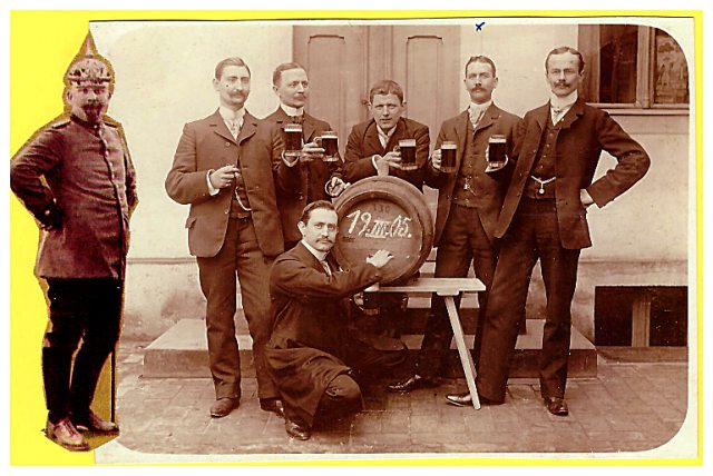 Es ist ungewöhnlich warm im März. Fröhlicher Umtrunk auf dem Grundstück der „Neuendorfer Kalk- und Mörtelwerke“, Potsdamer Straße 9 = die spätere Wilhelmstraße 14 – Baustoffe, Brennmaterialien und Steinguterzeugnisse. Das ist das Grundstück rechts neben dem Deutschen Wirtshaus von Ulrich & Runge. Mein Vater, August Janecke, ist der 2. von rechts. Wir aber wohnen nebenan im Betriebsteil Wiesenstraße 20–22.