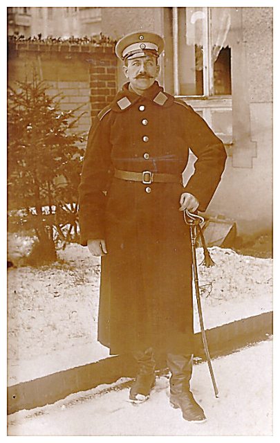 Auf Kurzurlaub. Mein Vater dient im Krieg im 1. Dragoner-Garde-Regiment und ist als Zug-Soldat mit Pferden unterwegs. Hier zu Weihnachten 1917, auf dem Hof vor dem Schlafzimmer unserer neuen Wohnung in Nowawes, Mittelstraße 22 – das wird ab 1930 die Wichgrafstraße 22 sein.
