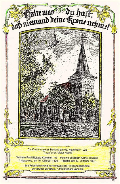 Wir, Käti und Richard, trauen uns – uns trauen zu lassen und schließen diesen Bund fürs Leben in der Nowaweser Friedrichskirche. Dieses Schmuckblatt hat mein Bruder gezeichnet.