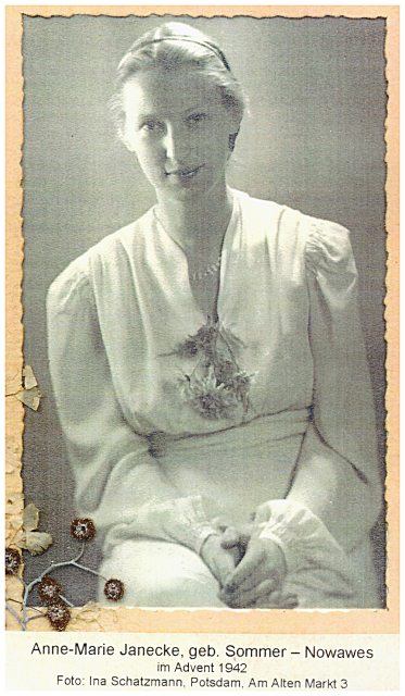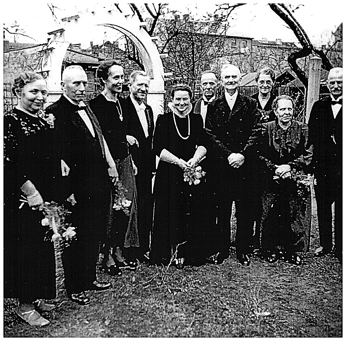 Hochzeit meines Bruders Richard mit seiner Verlobten Anne-Marie Sommer, im Frühjahr 1941. Beide sind hier momentan nicht zu sehen, dafür aber von li. nach re.: Betty oo Ferdinand Pehlke (Stadtbauinspektor in Nowawes) – Elisabeth (geb. Reichmuth) oo Viktor Hasse (Pfarrer in der Friedrichskirche) – ich, Käte, die Schwester des Bräutigams – Paul Muster (Architekt in Potsdam) – unser Vater August Janecke – Luise Hasait (geborene Surau, Tante der Braut) – die Brauteltern Margarethe (geborene Runge) oo Max Sommer (Schlosser, Elektrotechniker) ... im Garten des Hauses Nowawes, Priesterstr. 68 (nach 1945 dann: Potsdam-Babelsberg, Karl-Liebknecht-Str. 121).