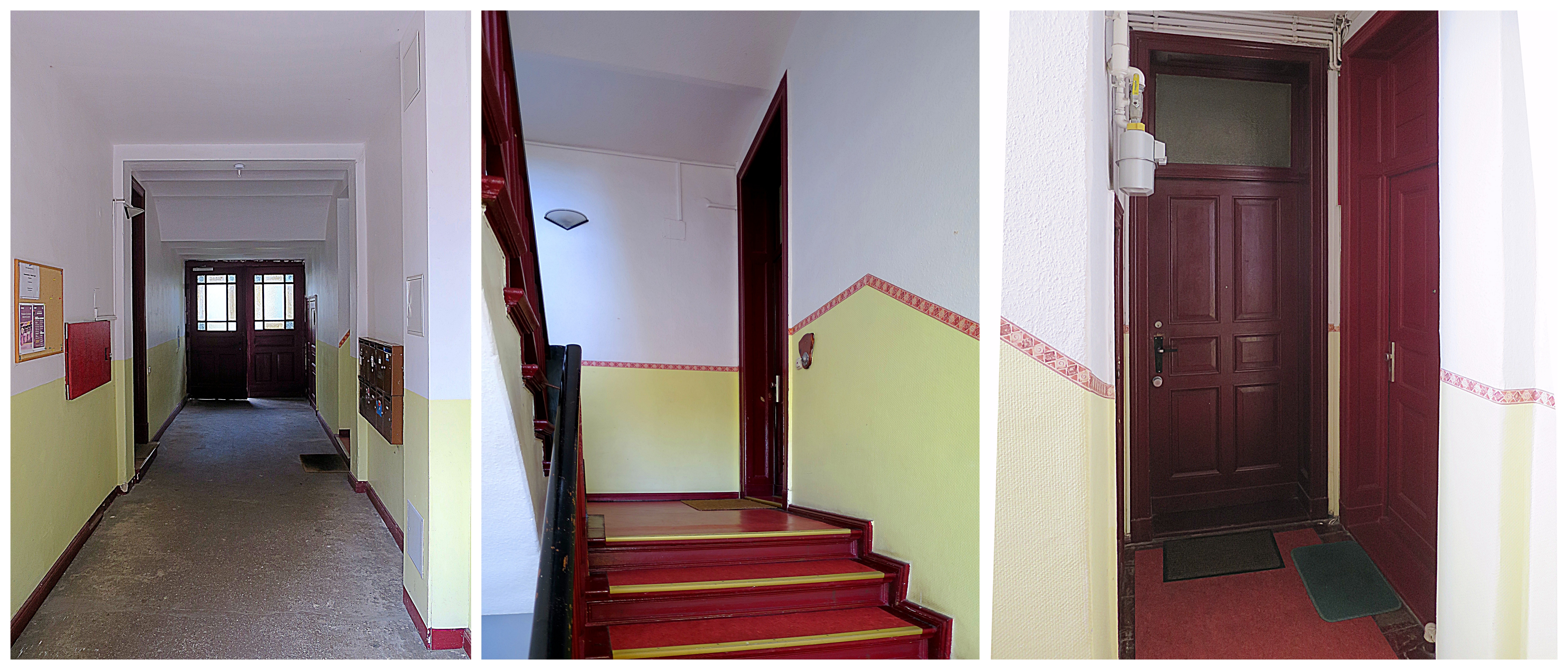 Und nun ein Blick in die Durchfahrt und auch in das Treppenhaus mit den Wohnungseingängen im 1. Obergeschoss.