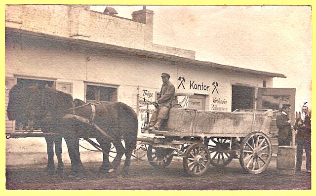1904 – Umzug nach Nowawes-Neuendorf1904 – Wir wohnen in der Wiesenstraße 20–221905 – Kalk- und Mörtelwerke Neuendorf, Wiesenstraße 20–22. Auf dem Bild: Der Betriebsteil „Baustoffe - Steingut-Erzeugnisse - Kohlen“, in der Potsdamer Straße 8 (spätere Wilhelmstraße 14, vermutlich rechts neben der Gaststätte „Deutsches Wirtshaus“). Rechts außen im Bild: August Janecke.Erst die Arbeit, dann das Vergnügen