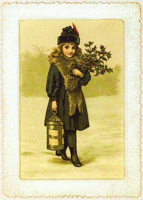 Diese Ansichtskarte kann auch stehend, als ein von hinten beleuchtetes Bild dienen. Die Handlampe erhellt dann das schneebedeckte Erdreich aber auch das Gesicht und die Hände des Mädchens.