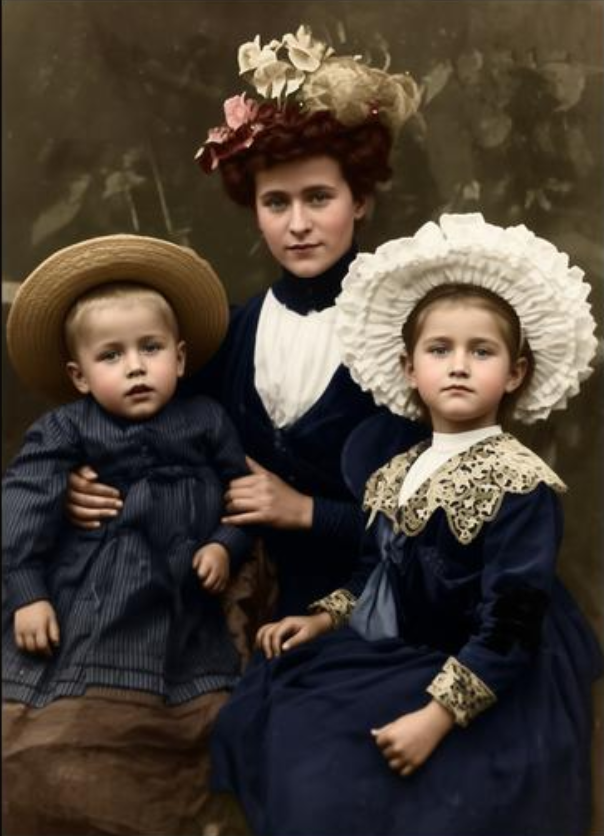 Das Original-Foto wurde 1901 in schwarz/weiß gefertigt. Herr Dr. H. Schulze erneuerte 2026 das alte Foto mithilfe von KI farblich. Das Bild zeigt uns Mamá Pauline Klara Antonie Janecke, geborene Dittwaldt. Geboren am 03. November 1872. Sie ist hier 28 Jahre jung. Die Tochter: Pauline Elisabeth Käte. Geboren am 13. Oktober 1897. Das Söhnchen: Alfred August Richard. Geboren am 01. Oktober 1900.