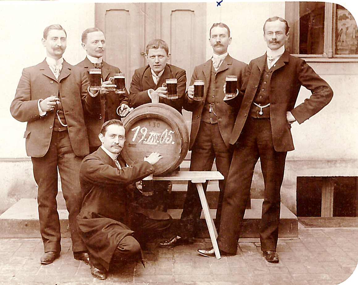 Fröhlicher Umtrunk gestandener Männer in Neuendorf. Der 4. Herr von links ist Geschäftsführer August Janecke, 35 Jahre alt.