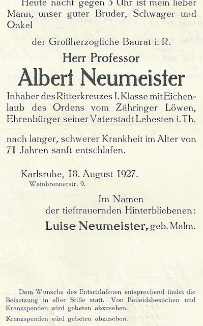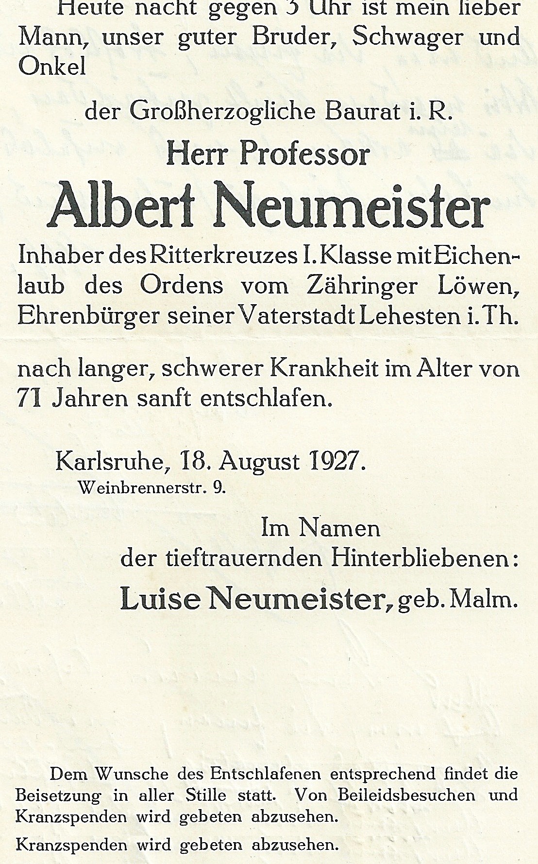 Baurat Professor Albert Neumeister mit seiner Frau Luise, einer geborenen Malm. Quelle: aus dem Archiv von Erich Heinemann – mit freundlicher Genehmigung.Die Zeitungsanzeige über das Ableben des Prof. Albert Neumeisters. Der Kreis des Lebens mit großem Schaffen hat sich vollendet. Quelle: Archiv Erich Heinemann