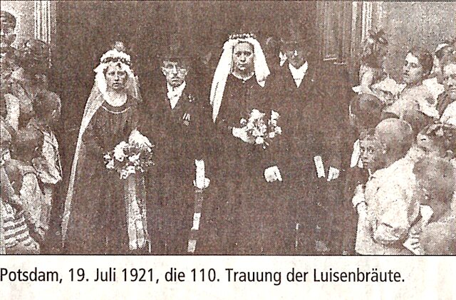 Wir schauen in die glücklichen Gesichter dieser jungen Eheleute, die gerade die Kirche verlassen. Die erste dieser Mehrfach-Trauungen fand am 19. Juli 1811 statt. Heute aber, bei Sommer oo Keilbach ist es nun schon die 19! Da der Tag der Trauung – 19. Juli – auch der Sterbetag der Stifterin Königin Luise ist, wird der Bund der Ehe traditionell in schwarzer Kleidung geschlossen.