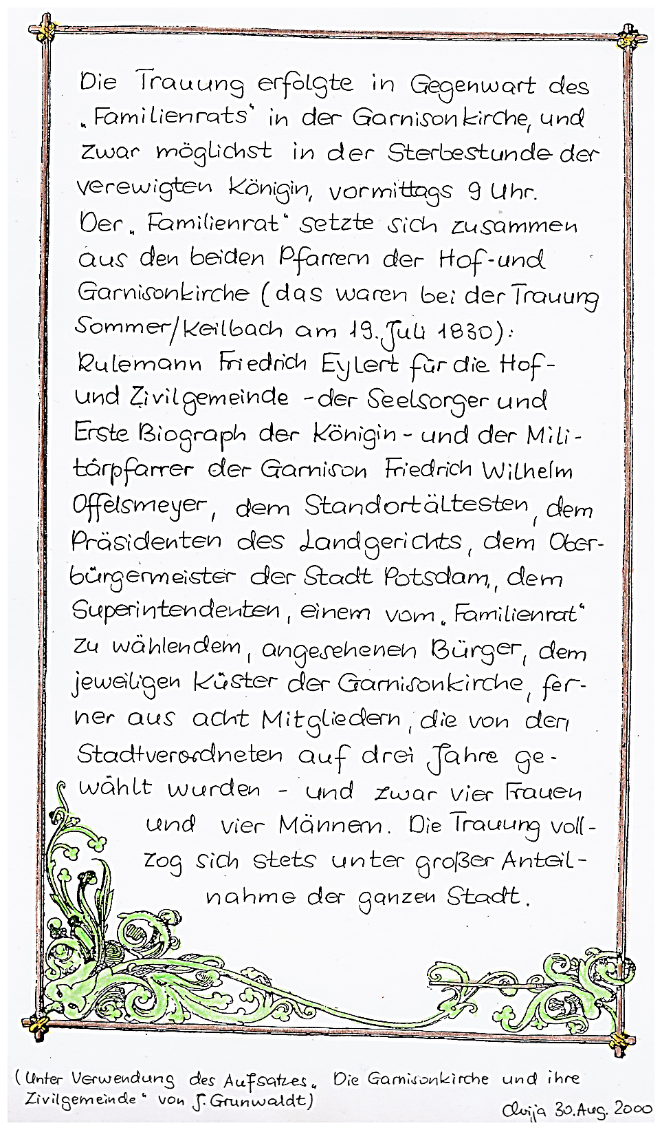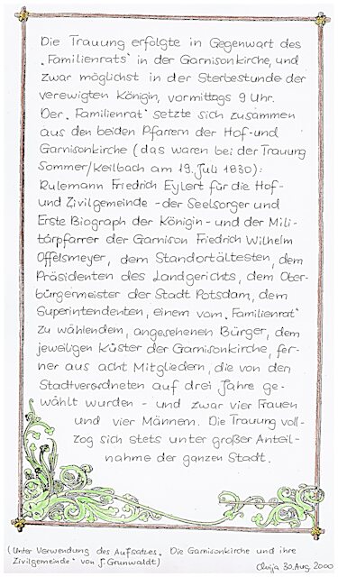 Stadtplanausschnitt von Potsdam mit den Einträgen von Wohnstätten der Familie.Dieser Bürgerbrief gilt nur als Muster (privat nachgestellt).Die Hof- und Garisonkirche, Breite Straße. Hier wurden wir getraut.Die Hof- und Garnisonkirche in PotsdamVor der Hof- und Garnisonkirche hielten auch „Riesen-Soldaten“ des 1. Garde-Regiments Wache Bildnachweis: Zeichnung Johann Gottfried Schadow, gemeinfrei, hier. Zeichnungsteile temporär überdeckt.Angaben zu unserer Trauung, auch im Kirchenbuch der Nikolai-Gemeinde.Wir sind ein Luisen-Brautpaar.Die Luisen-Stiftung diente der Unterstützung bei der Haushaltsgründung.Bischof Dr. theol. Eylert