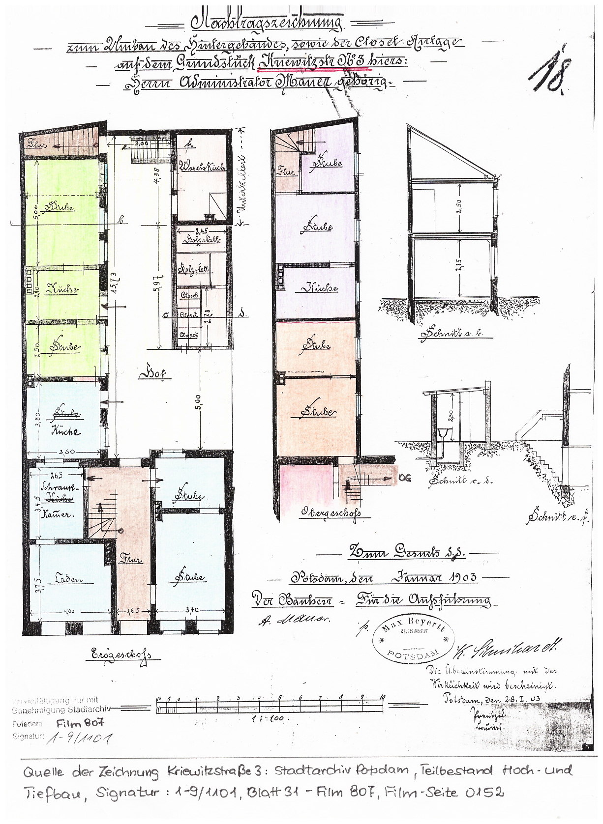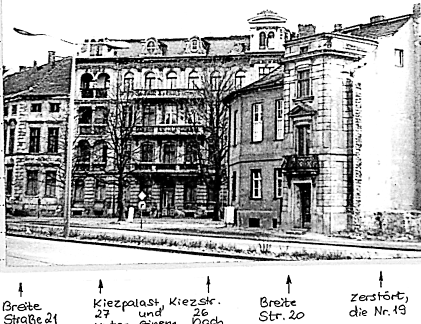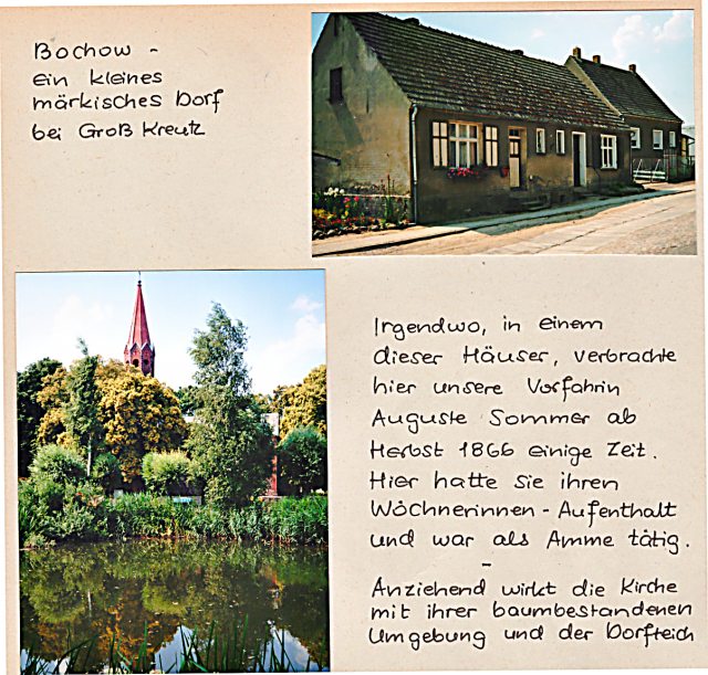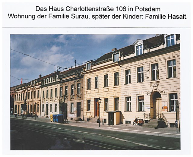 Vor der Ehezeit lebte Auguste in Bochow im Havelland als Amme.Hochzeit: 1870 – Trauung in der Heiligengeistkirche. Hier wurde Auguste auch schon getauft.Unsere erste Wohnung befindet sich in der Potsdamer Kiezstraße 27. (Foto: Siegfried Lieberenz, 1976.)Der Eingang zum „vormaligen Kiez-Palast“. (Foto: Siegfried Lieberenz, 1976.)Ein Architektur-Detail an der Loggia des Dachgeschosses. (Foto: Siegfried Lieberenz, 1976.)1874 zogen wir in die Kriewitzstraße 3.Später zogen wir für einige Jahre in Berlin und danach lebten wir ein Jahrzehnt in Gommern.Das Haus Charlottenstraße 106 in Potsdam war unsere Wohnung für den Lebensabend 1914 bis 1919.Die Charlottenstraße kurz vor dem Luisenplatz. Im 3. Haus von links (mit der Einfahrt) wohnte Familie Surau.