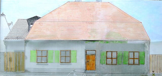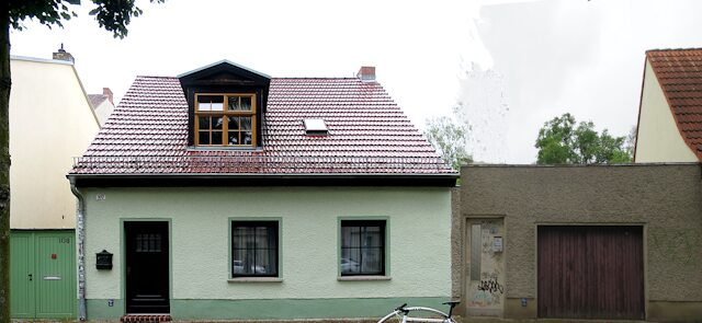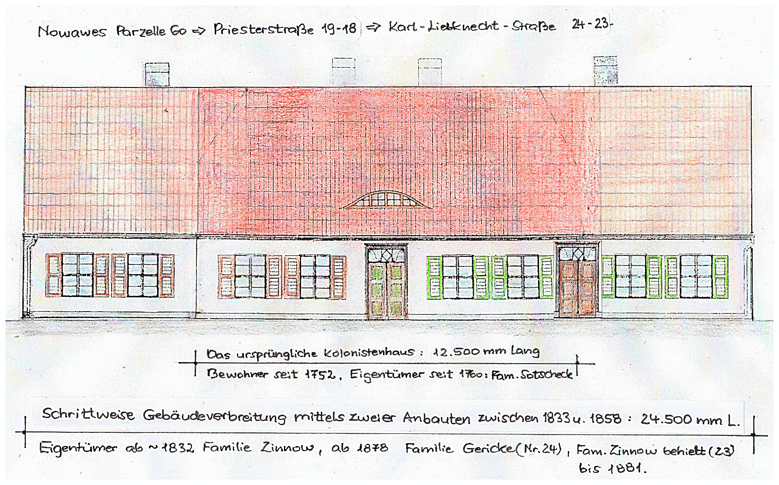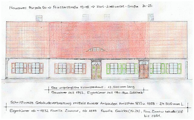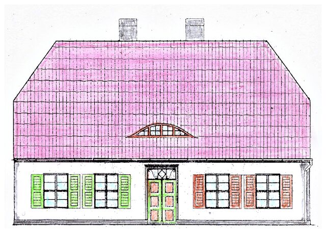 Das erste Haus für die eingewanderte Familie Max(a) auf Parzelle 073 => Priesterstraße 55 => Karl-Liebknecht-Straße 107, mit der Andeutung der damaligen Gestalt.