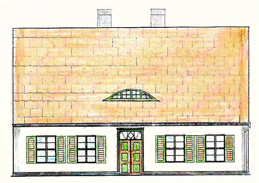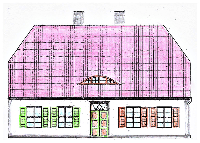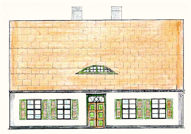 Eine spätere, modernisierte Form des Hauses. Das komplizierte Krüppelwalmdach wich dem Satteldach und so entstand in den Giebelbereichen der Dachetage zusätzlich etwas mehr Raum.