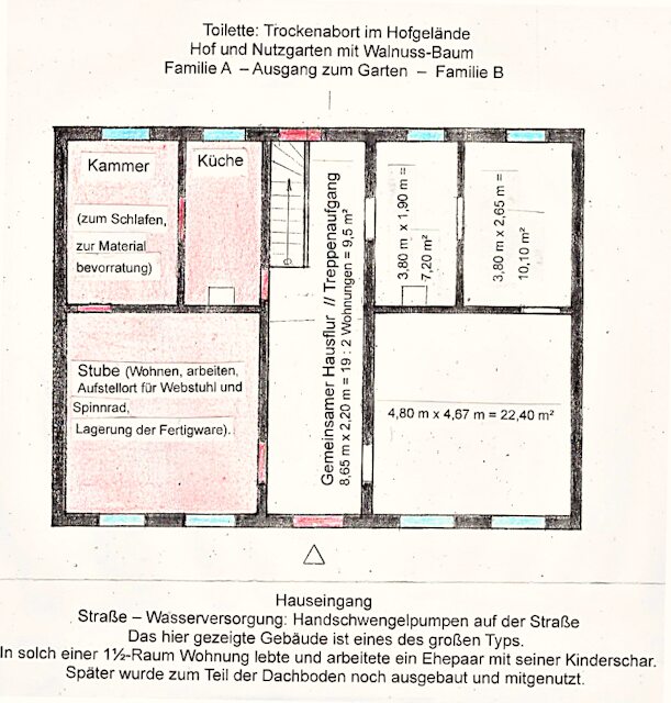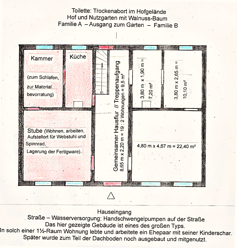Der Grundriss verdeutlicht, wie sehr beengt es in diesen Räumen zuging – beim Wohnen, Arbeiten, Lagern der Materialien ... bei einer oft größeren Kinderschar, die bei ungünstiger Witterung hier auch einen sehr bescheidenen Spielplatz suchte ... aber schon sehr zeitig zur Mitarbeit herangezogen wurde.