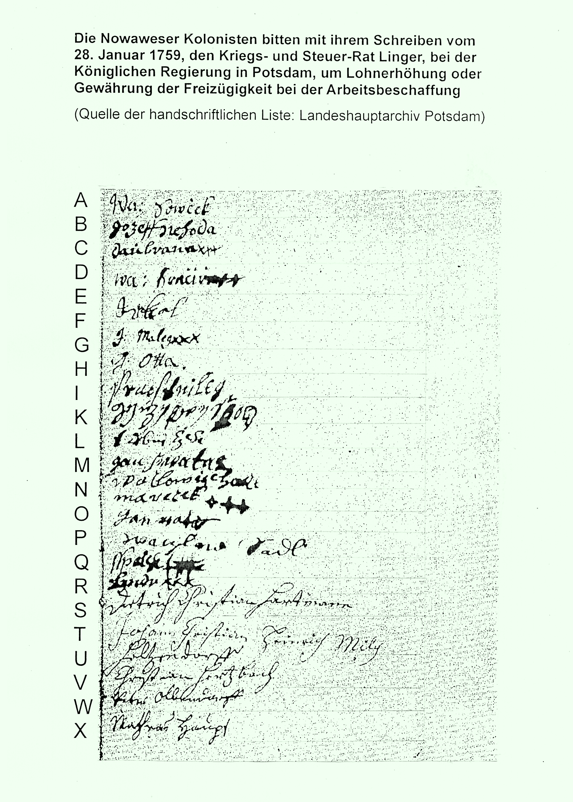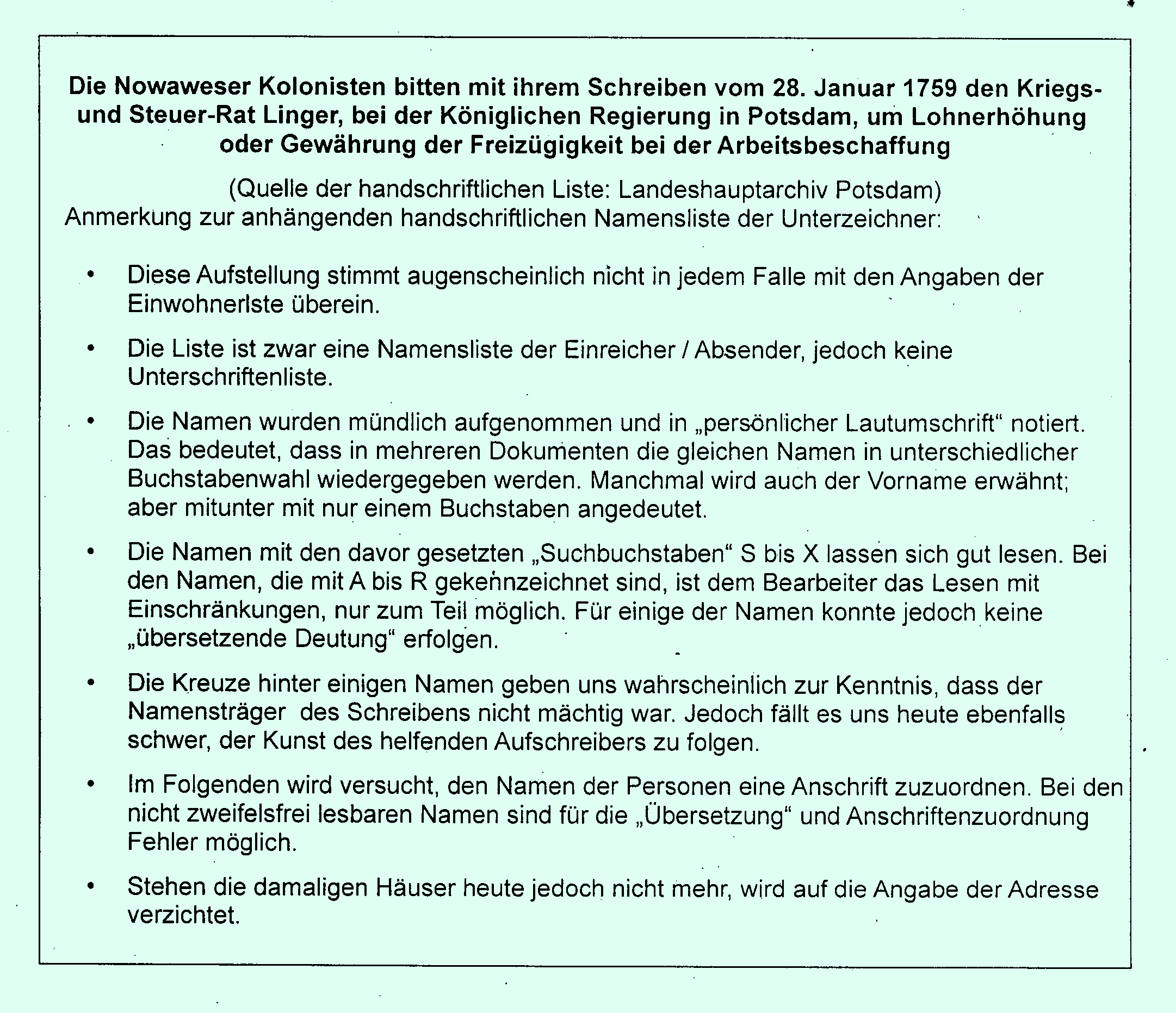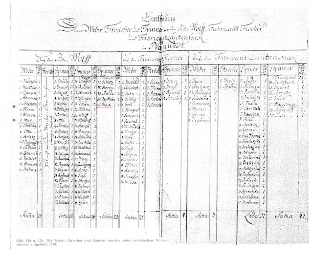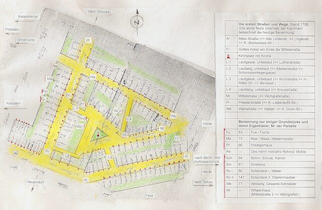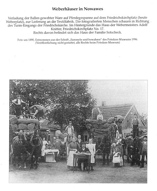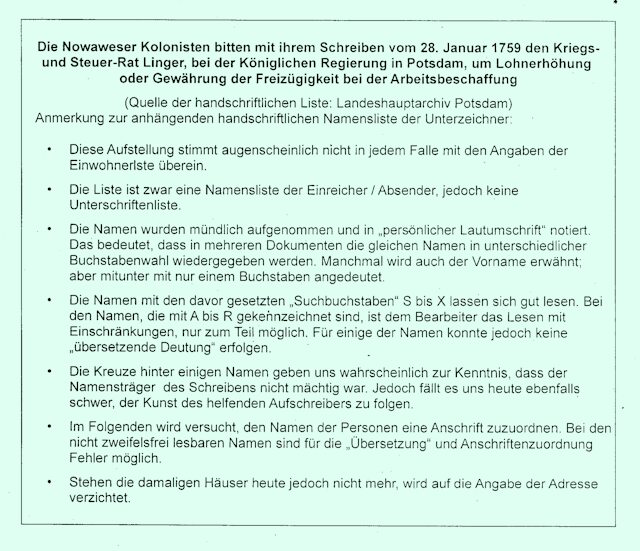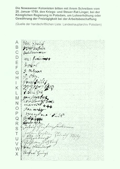 Sekundärquelle: Günter Vogler, „Zur Geschichte der Weber und Spinner von Nowawes 1751–1785“, eine Veröffentlichung des Bezirksheimatmuseums Potsdam, Heft 7, Potsdam 1965.