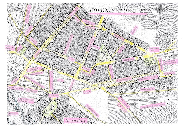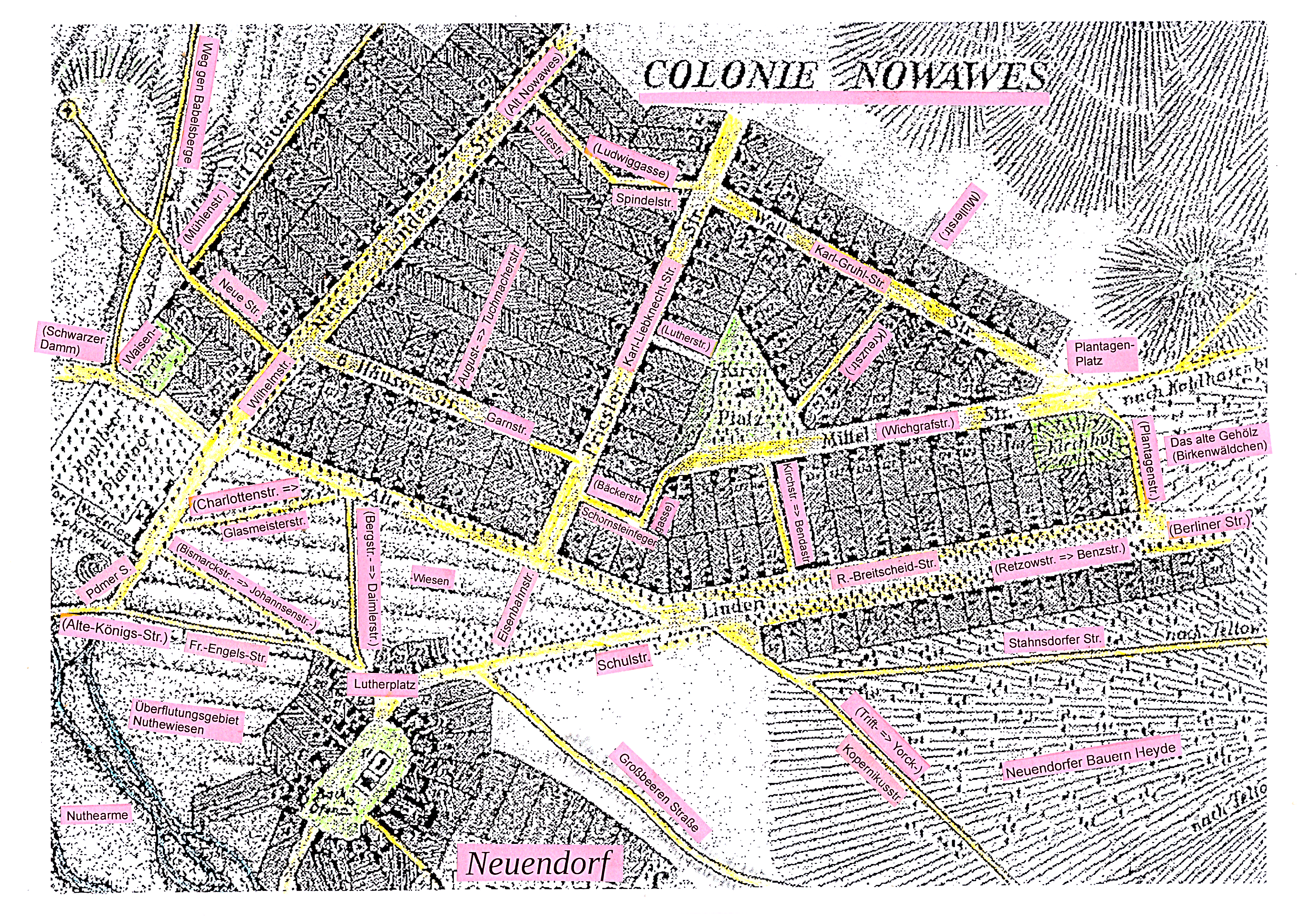 Hier nochmals der Plan aber mit Eintrag der aktuellen Straßenbezeichnungen – zum leichteren Zurechtfinden in heutiger Zeit.