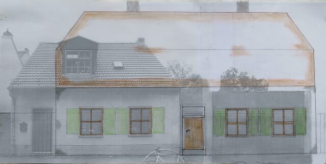 Anmerkungen: Das Gebäude war war ursprünglich ein üblich 5-achsiges Typenhaus. Die Umgestaltung zu einem „halben“ Haus ist relativ jung. Hier, in der Skizze, der Versuch des Situationsvergleichs von ursprünglichem Aussehen und dem gegenwärtigen Bestand.