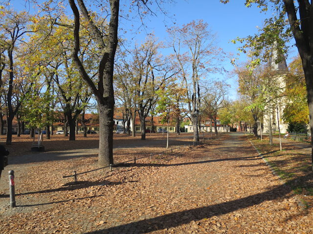 Mittelpunkt der Siedlung ist der dreieckige Kirchplatz => Weberplatz, in dessen Zentrum die Friedrichskirche steht, selbst, wenn sie hier an den Bildrand „gerückt“ wurde.
