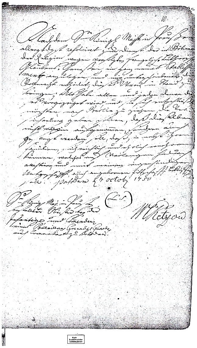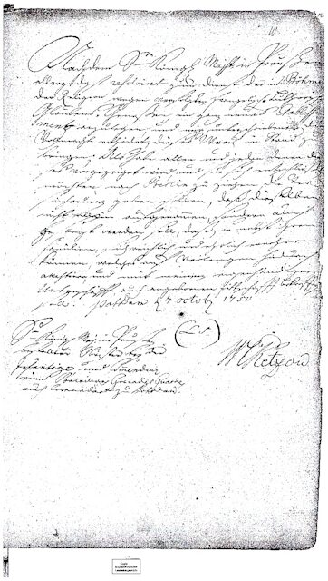 Im Auftrag des Königs Friedrich II. verfasst der Organisator für den Bau der künftigen Weber- und Spinnerkolonie, Oberst Wolf v. Retzow, ein Einladungsschreiben an die aus religiösen Gründen verfolgten evangelischen Böhmen. Diese Werbung wird, vielfach abgeschrieben, als Handzettel in verschiedenen Böhmischen Städten verteilt.–