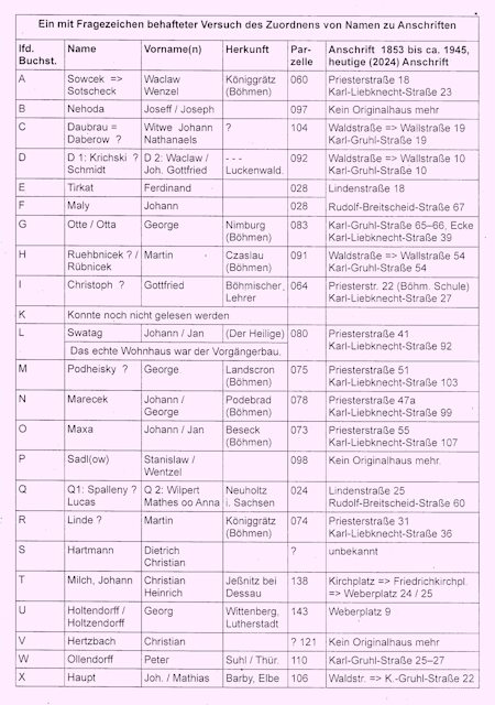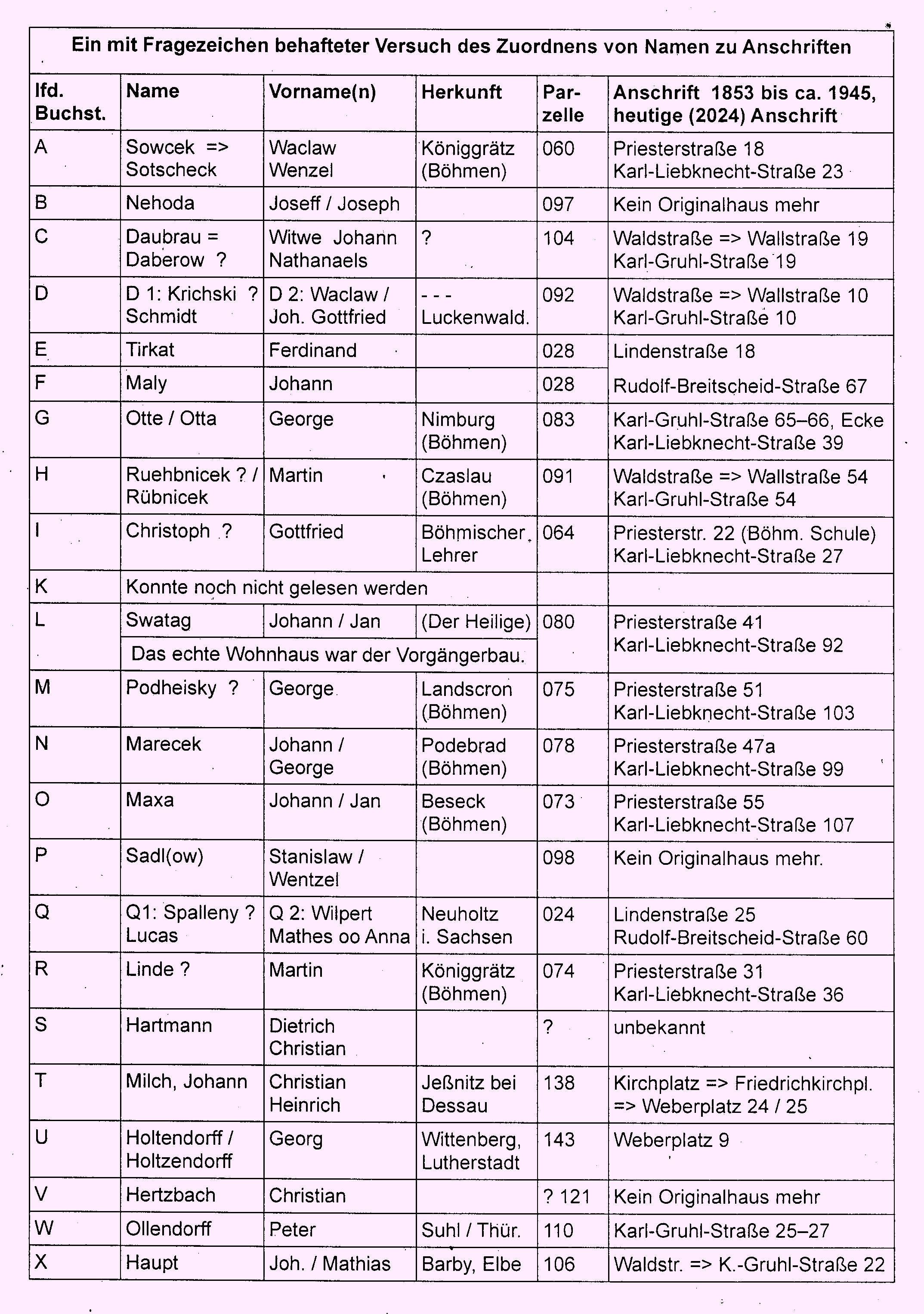 Nebenan in der Priesterstraße 65 => K.-Liebknechts-Straße 118 wohnten in der Zeit um 1792 die Familie David Maxa oo Anna Malina. Das damalige Haus blieb jedoch ebenfalls nicht erhalten, musste einem Neubau weichen – aber wir wissen ja, wie es etwa aussah.