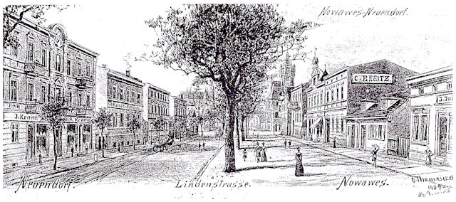 Das Bild zeigt uns die Nowaweser Priesterstraße mit dem Blick über die querliegende Lindenstraße hinweg, nach Neuendorf zum Bahnhof.