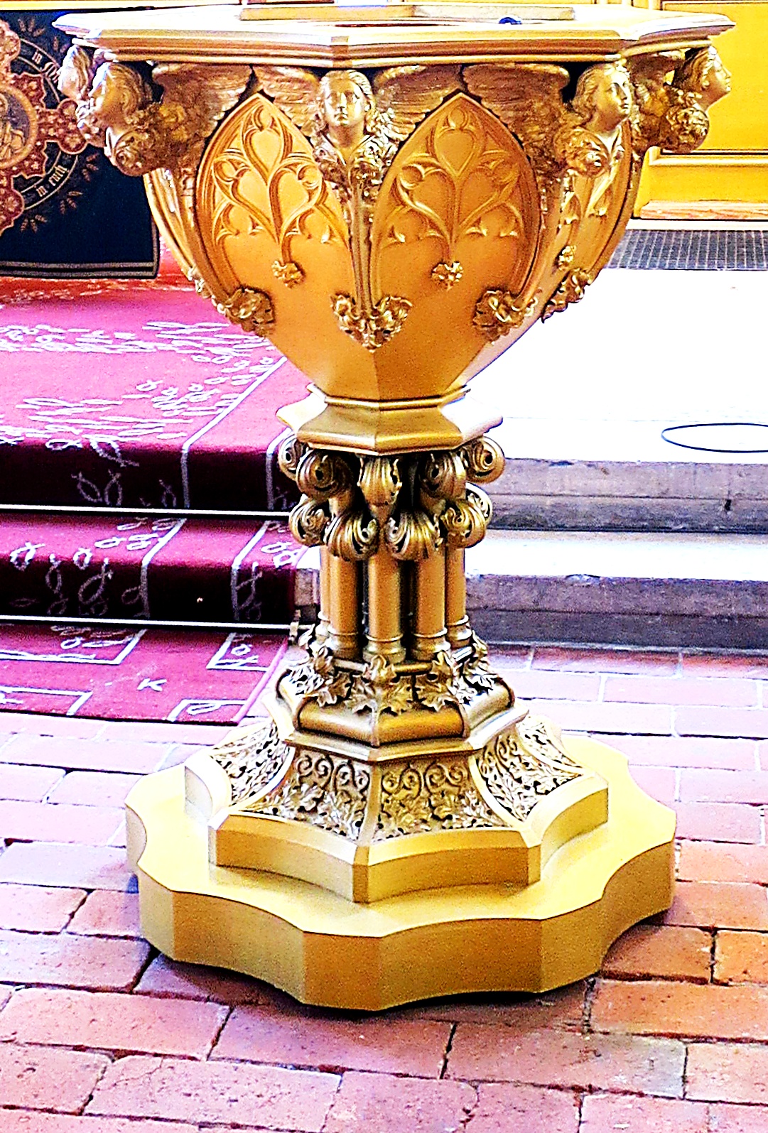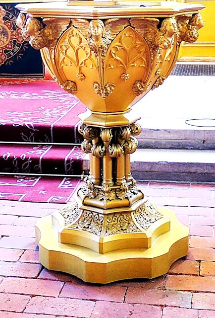 Das Taufbecken, mit dem zahlreiche Säuglinge „Bekanntschaft schlossen“. Während der längsten Zeit des Bestehens des Taufbeckens, ist jene reich wirkende Goldbronze jedoch mit einer schlichter wirkenden schwarzen Farbgebung überzogen.