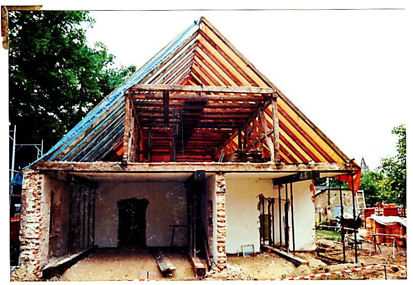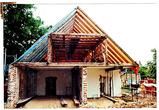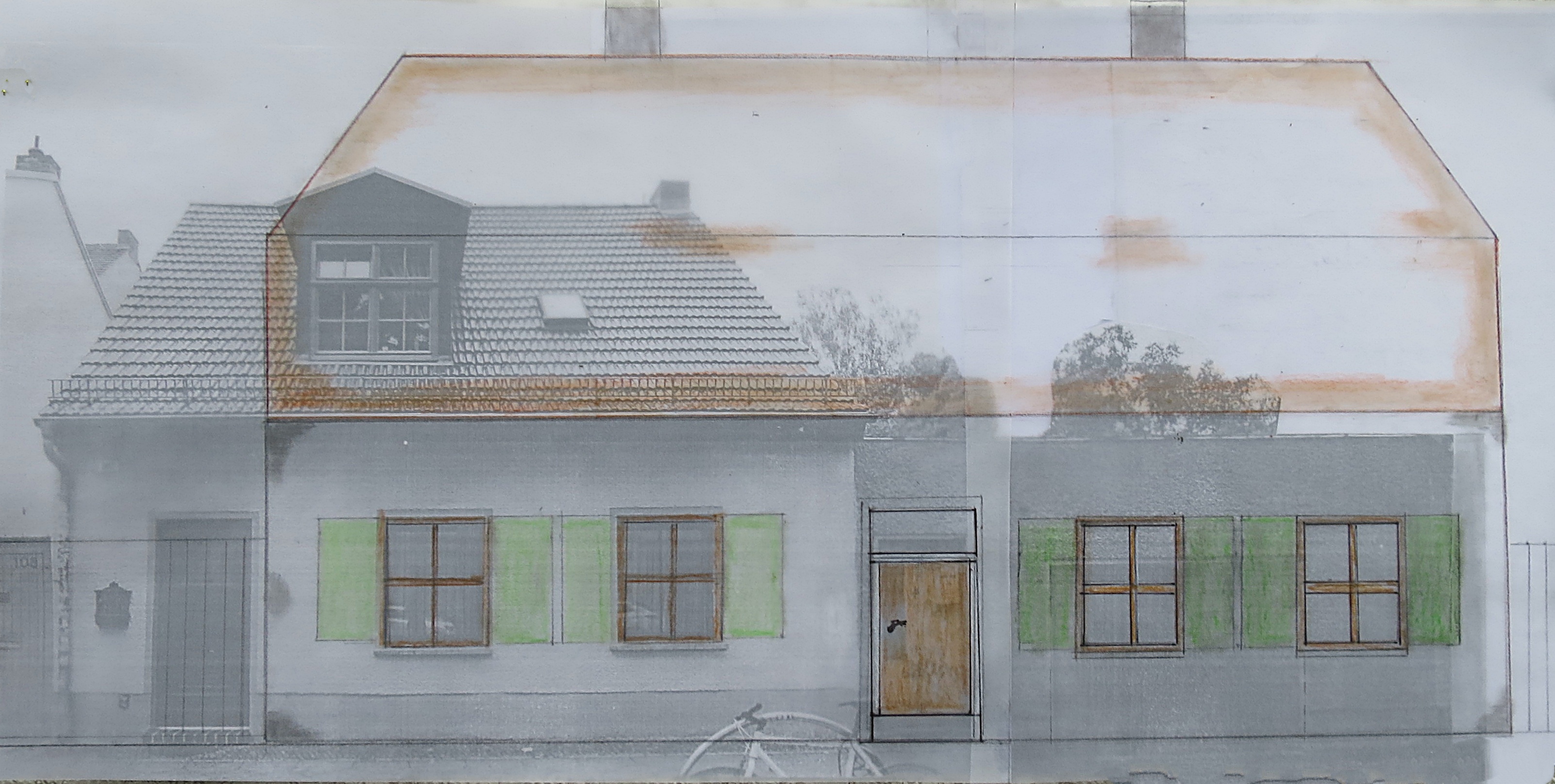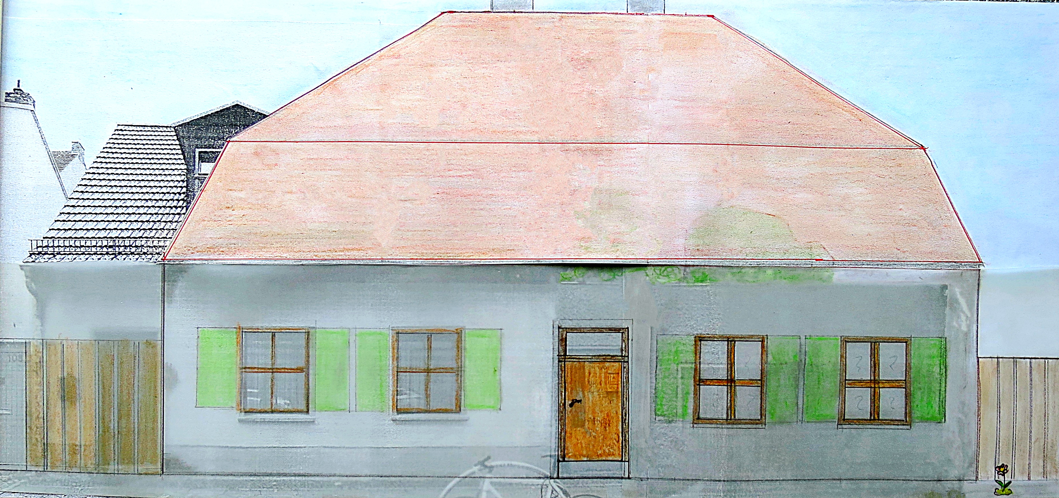 Was gehört zu den Veränderungen? Die linke Achse des bestehenden Bauwerks (mit Tür) ist ein Anbau, der nicht zum originalen Haus gehört.