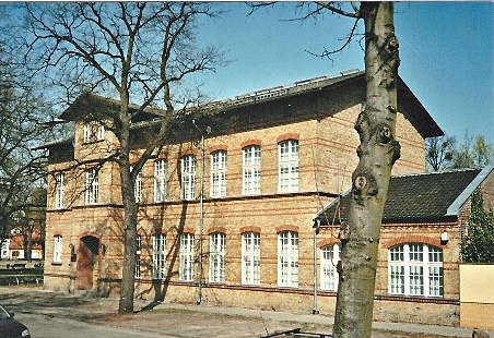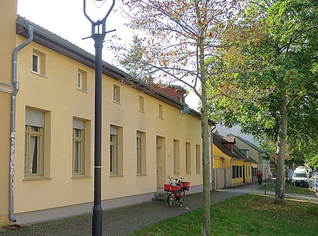 Der von der Regierung eingesetzte Kommissar für die Verbesserung der Lebensverhältnisse der Weber in Nowawes, August Wichgraf, hatte unter verschiedenen Maßnahmen auch eine Weberei-Schule für das Lehren und Üben neuer Handwerkstechniken, einschließlich der modernen Maschinenweberei bauen lassen. Hier sehen wir den Nachfolgebau, eine notwendige Vergrößerung des Wichgrafschen Gebäudes. Heute eine Berufsschule der Industrie- und Handelskammer.