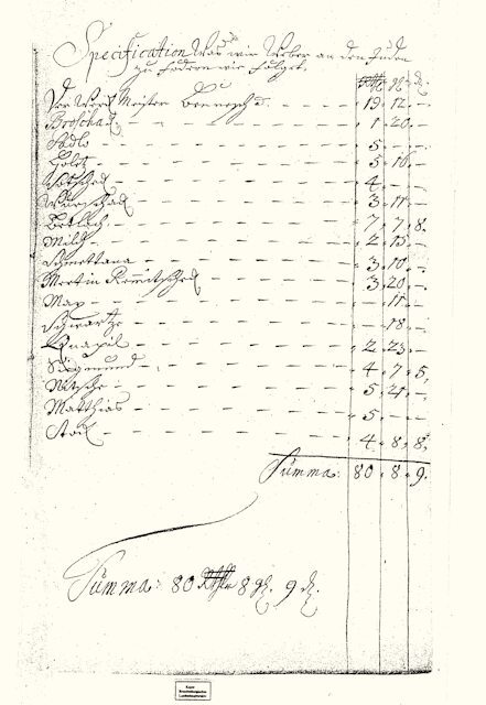 Einige Nowaweser Weber stellen eine Liste darüber zusammen, was die Weber vom Verleger, dem Juden Wolff, in Reichstalern, Groschen und Pfennigen fordern. Die Forderungen beziehen sich offenbar auf monetäre Meinungsdifferenzen beim Arbeitsmaterial und / oder beim Lohn.