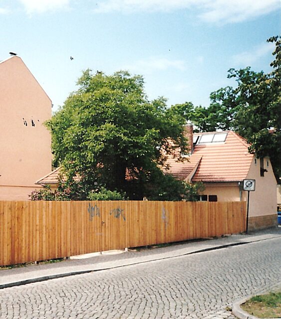 Typisch ist die hohe sichtdichte böhmische Bretterzauneinfriedung. Diese hier etwa 40 m lang. Der Autor war als halbwüchsiger Bauhelfer mit dem Errichten des Vorgängerzaunes vertraut. Auch auf diesem Grundstück erlebte er viele frohe Stunden.