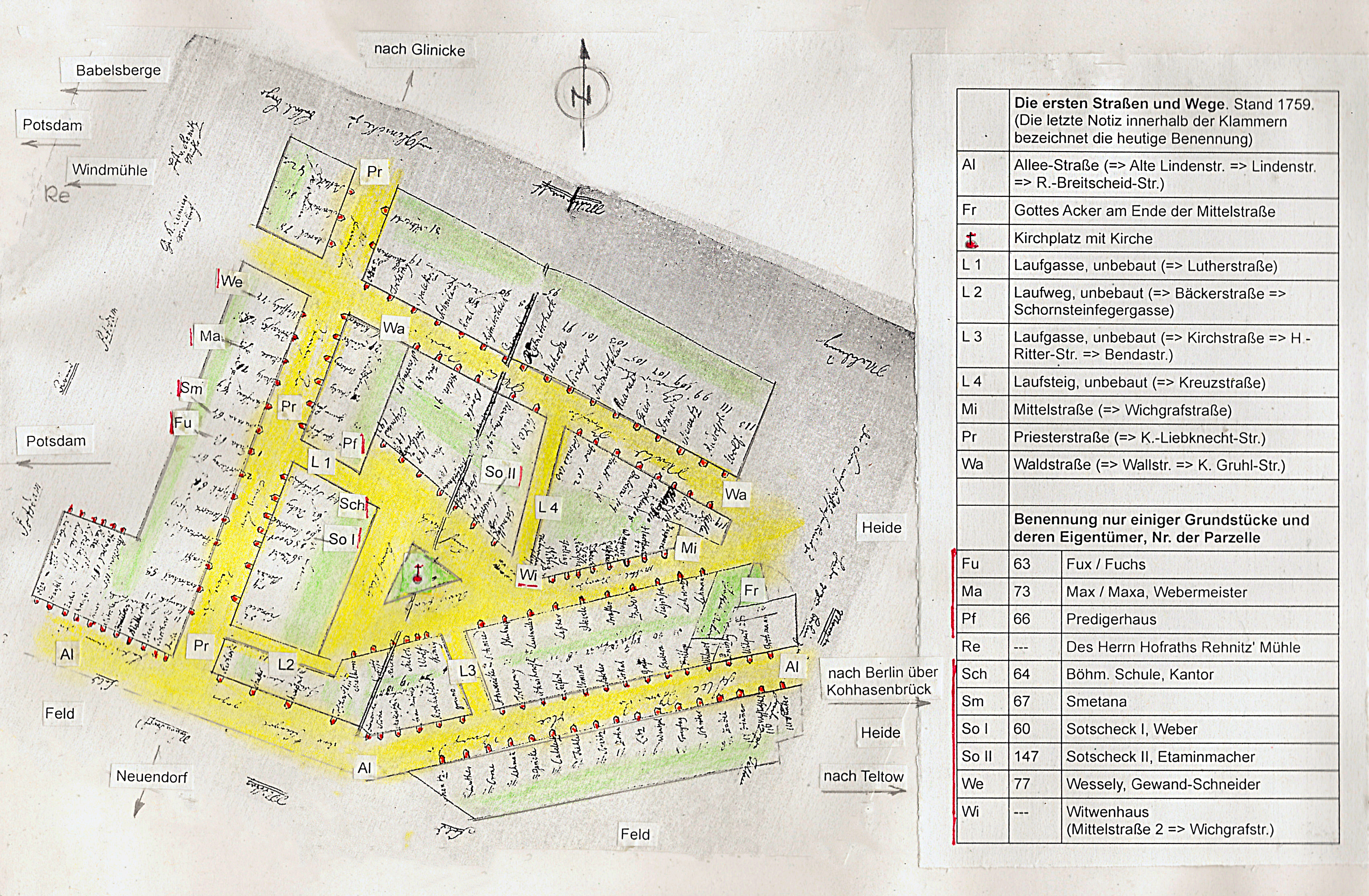 Pfeil 1 zeigt auf das Grundstück, das die Familie Maxa erhielt (Parzelle 73) und Pfeil 2 auf das Haus, das Schwiegervater Sotscheck bekam (Parzelle 60). Auf Parzelle 64 steht das Böhmisches Schul- und Kantorhaus. Dem gegenüber, auf der anderen Straßenecke steht das Prediger-Wohnhaus.