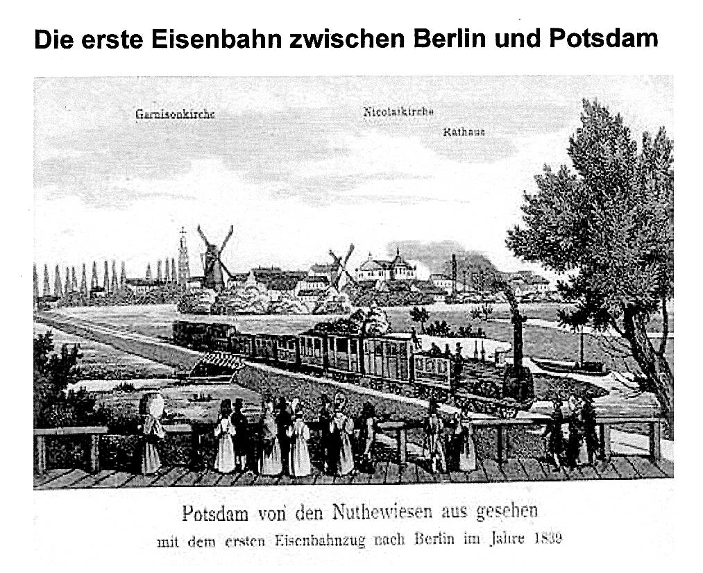 Die Strecke wurde 1838 (nicht 1839 wie auf der Karte bemerkt) in Betrieb genommen. Weil sie die erste hierzulande war, wurde sie auch „Die Stammbahn“ genannt. Sie begann an der Havel, dicht am Potsdamer Zentrum, und führte durch Nowawes und Neuendorf, dann über Zehlendorf (Kreis Teltow) bis nach Berlin, Potsdamer Bahnhof. Diese 26-Kilometer-Distanz wurden in etwa 40 Minuten bewältigt. Näheres ist zu lesen im Dokument Die Preußische Stammbahn