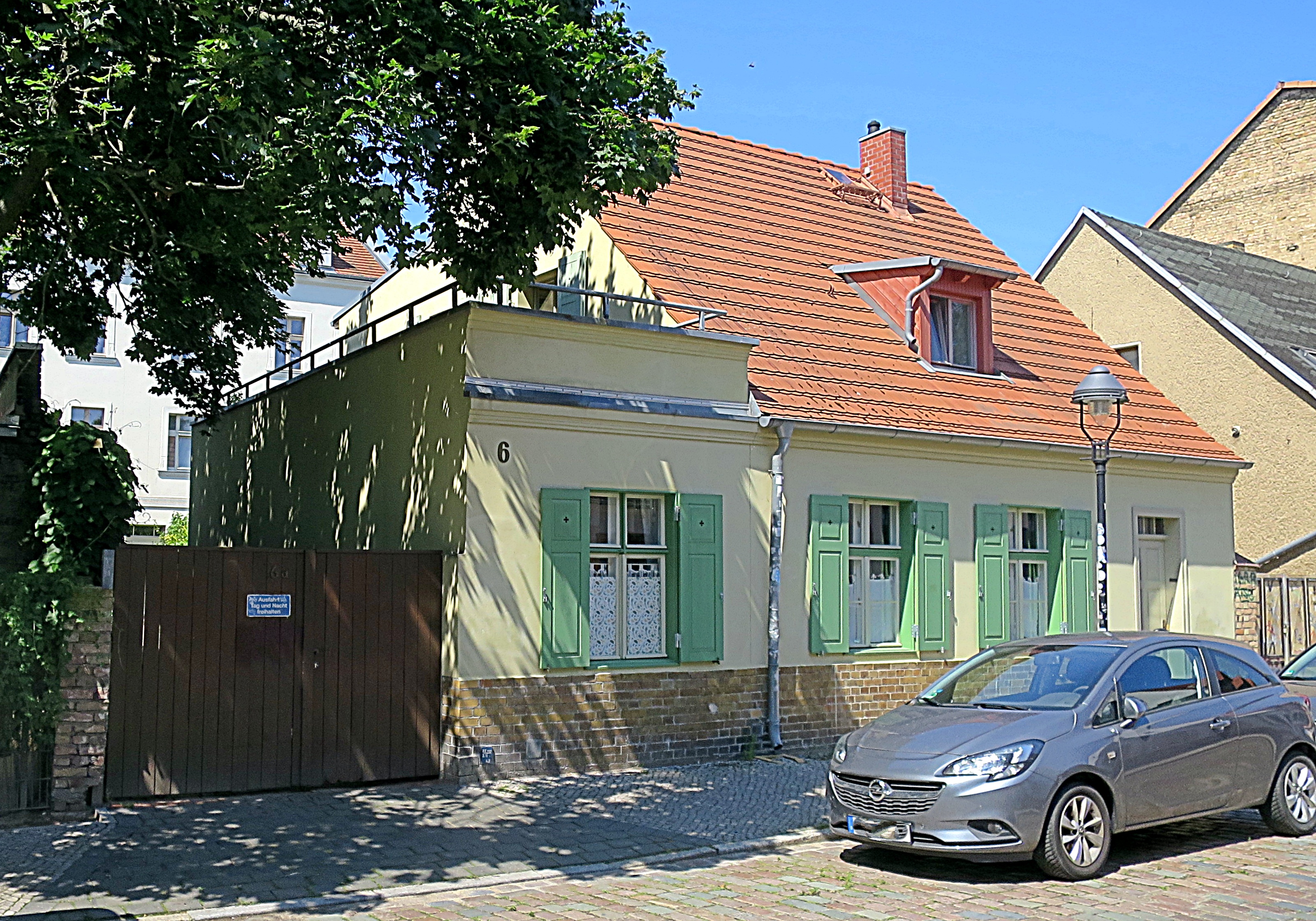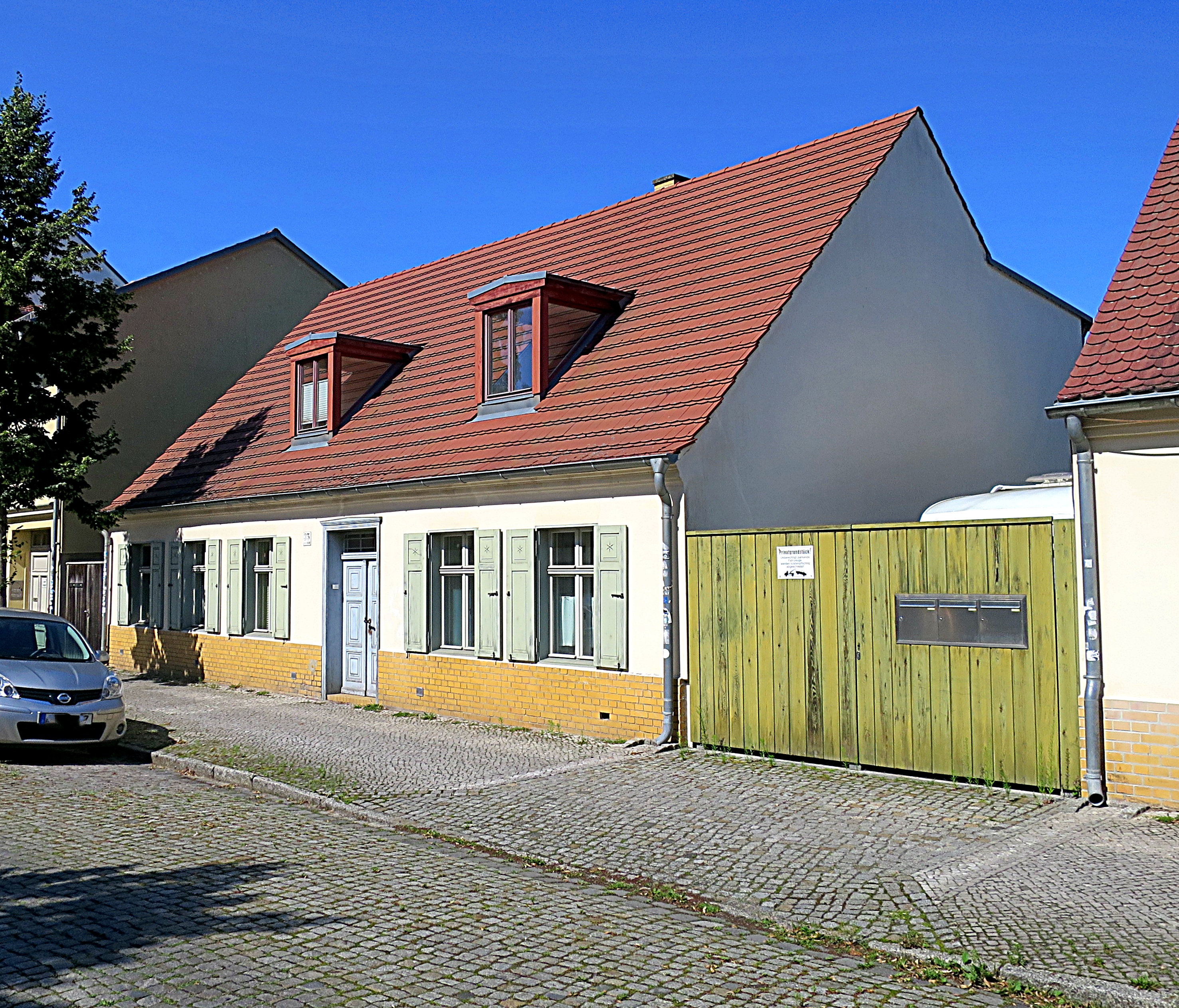 Heute: links – das kleine Wohngebäude, rechts eine dunklere gemauerte Wand mit einer Tür zum Hof und rechts daneben eine Toreinfahrt.